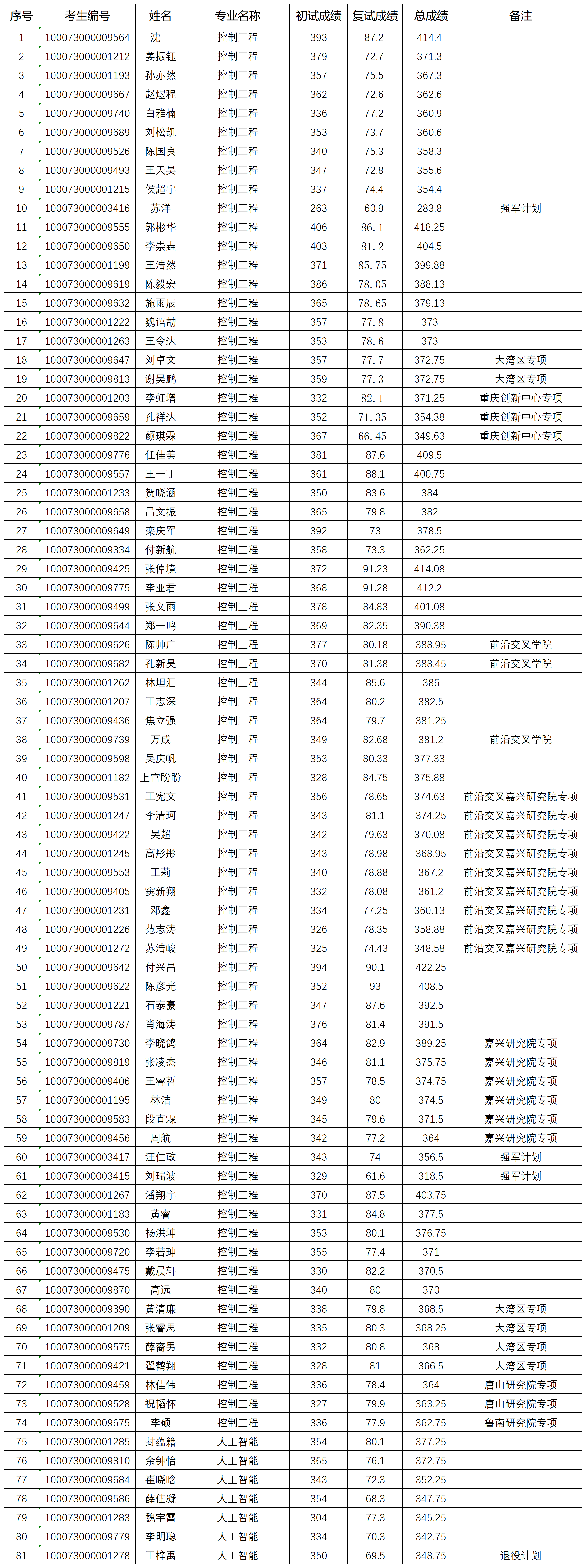 自动化学院2023年研究生入学考试“专业学位”拟录取名单