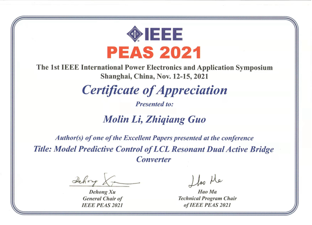 北理工自动化学院硕士研究生李沫霖、助理教授郭志强获国际电力电子与应用研讨会(IEEE PEAS 2021)优秀论文奖