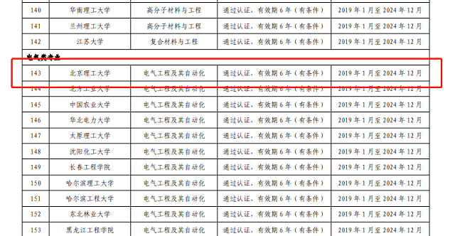 近日,教育部高等教育教学评估中心、中国工程教育专业认证协会正式发布《关于公布北京工业大学机械工程等460个专业认证结论的通知》(工认协[2019]29号),我校电气工程及其自动化专业名列其中,顺利通过工程教育专业认证,有效期6年(2019年1月至2024年12月)。