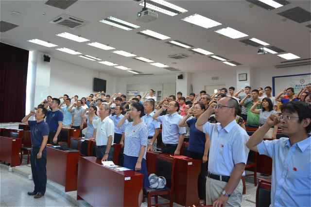 会议最后,预备党员面对党旗进行入党宣誓,参会党员同时重温入党誓词。