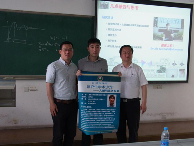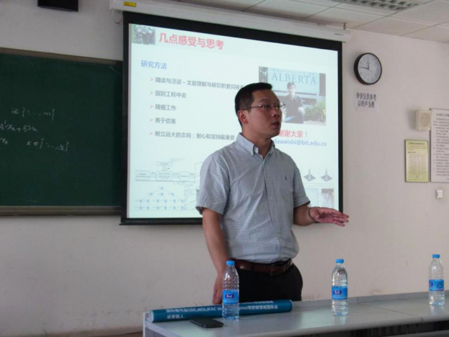 为了营造浓厚的学术氛围,提高科研能力,2016年5月28日上午,自动化学院首届学术沙龙的第二期活动在研究生楼103举行,这次的主讲人是史大威老师。出席本次学术沙龙的有研究生院常务副院长王军政、自动化学院党委书记金军、国资处副处长刘昕戈,同时还有自动化学院相关方向的硕士研究生和博士研究生。