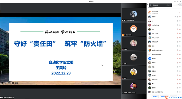 按照学校党委工作部署,12月23日上午,自动化学院2022年度述职述廉大会线上召开。自动化学院领导班子、全体教职员工参加会议。会议由学院党委书记王美玲主持。